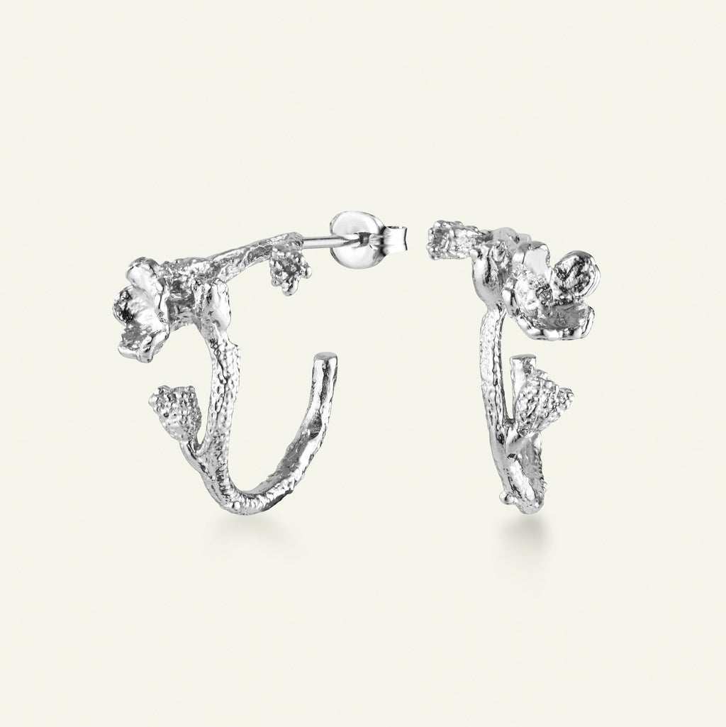 Forglemmegei hoop-øreringer fra Flora Danicas 70-årsjubileumskolleksjon 2022. Øreringene har form som en bøyd stilk med en liten, fin forglemmegei-blomst på. Designet er skapt av naturen selv, og den opprinnelige strukturen og de små, fine detaljene i både blomsten og stilken er godt bevart.