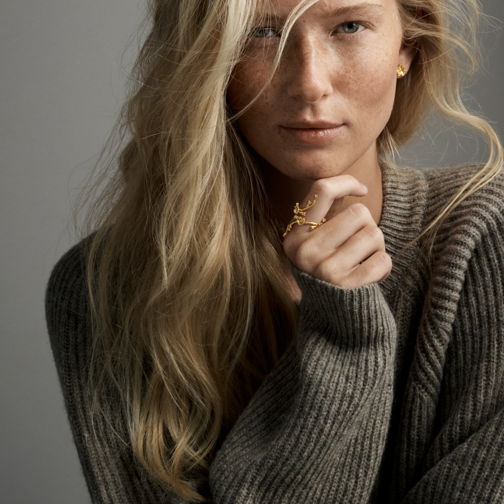 Den nye forglemmegei statement-ringen er håndlaget i høy kvalitet og skapt med den største respekt for miljø og bærekraft i både produksjon og materialer. Ringen er laget av 100 % resirkulert sterlingsølv med 22 karat forgylling.