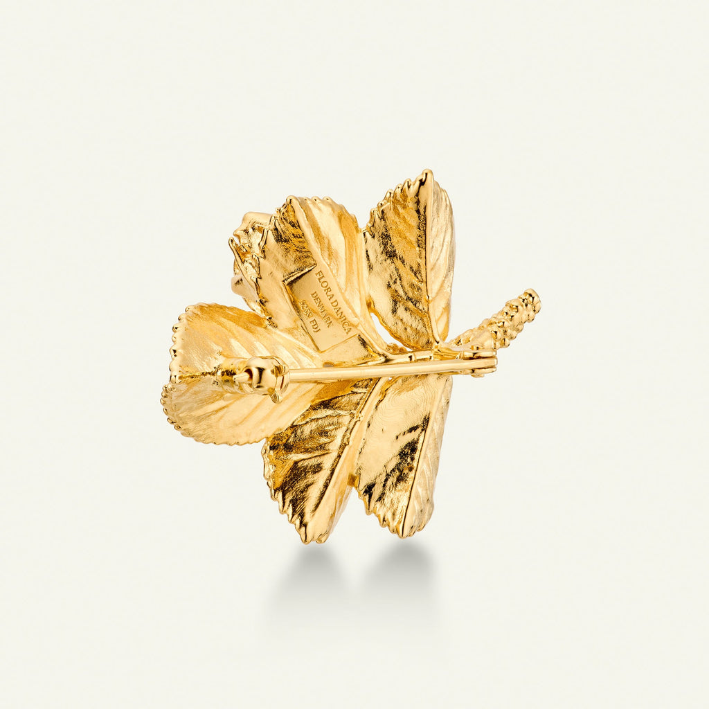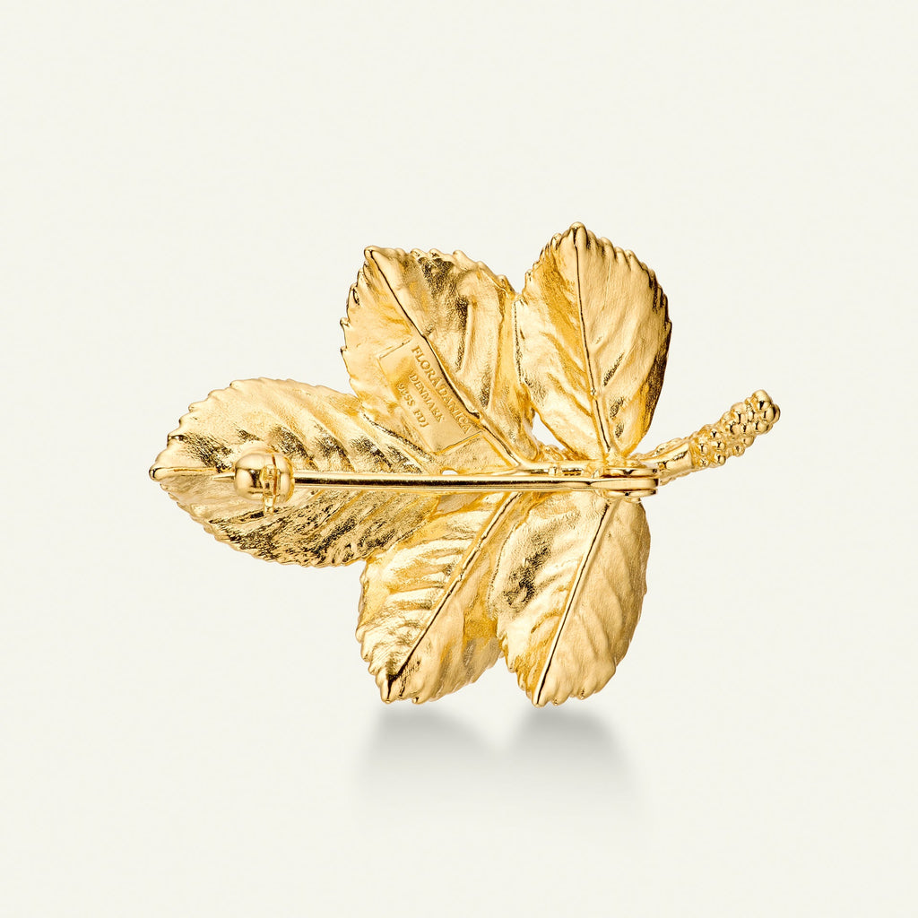 Brosjen er formet etter et ekte rosenblad med et spirende roseskudd, bevart i Flora Danicas historiske arkiver og gjenskapt i de fineste materialer med dyp respekt for naturens detaljer. De lett buede bladene, den naturlige strukturen og det livlige skuddet skaper et uttrykk av både styrke og eleganse.