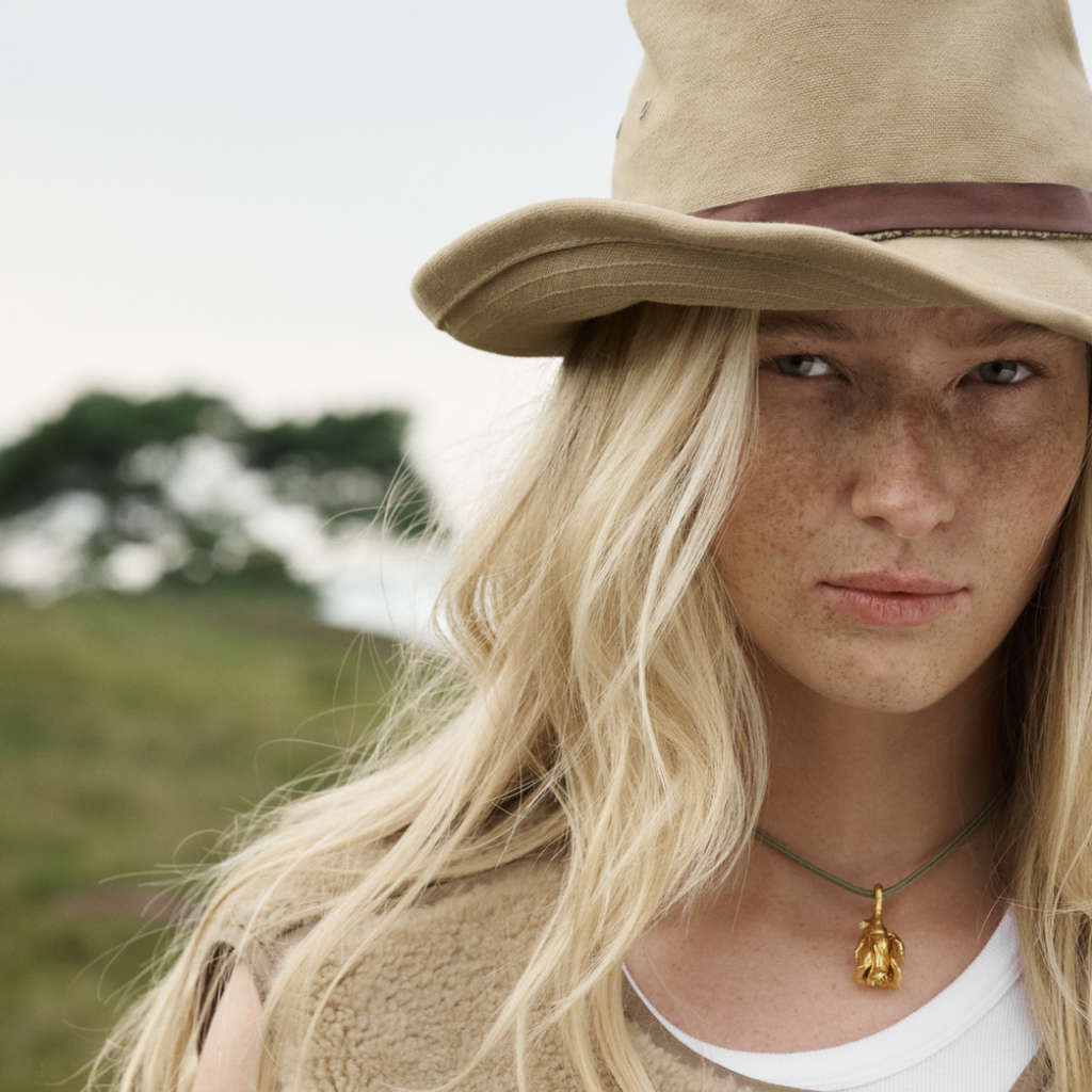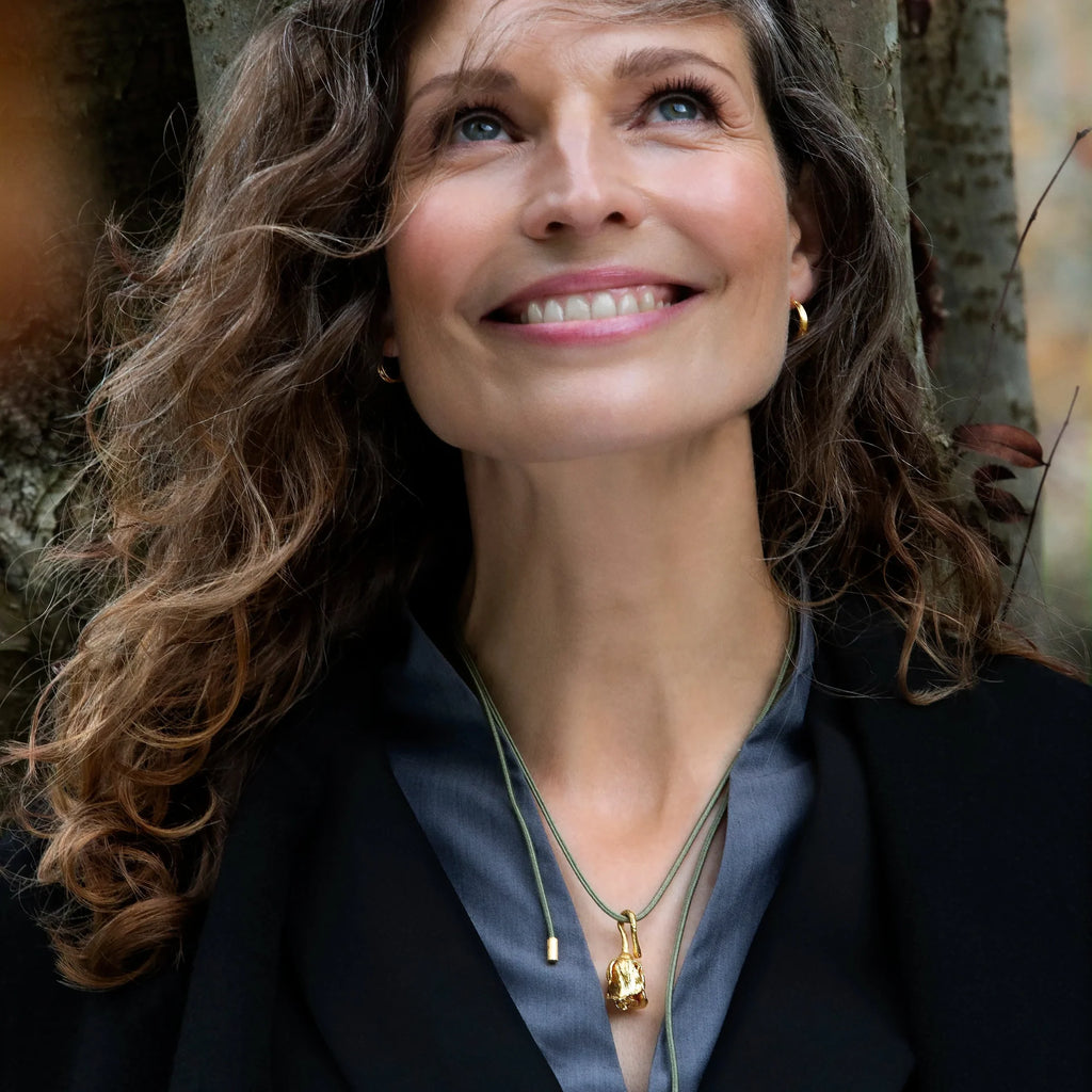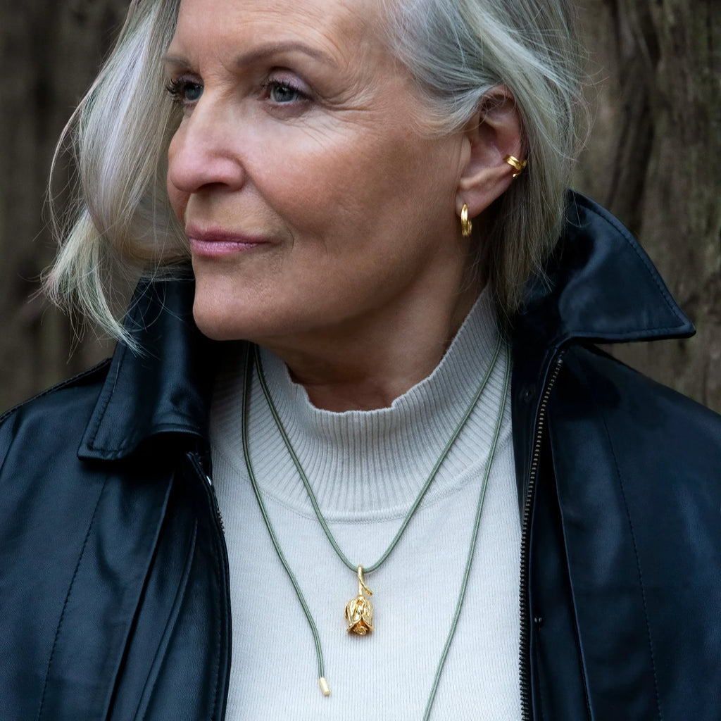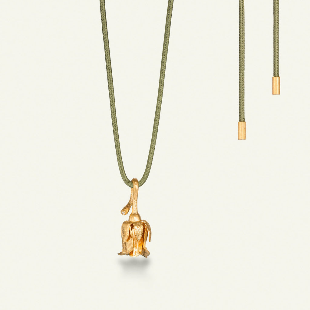 Rosen måler 3,2 cm i høyden og 1,3 cm i bredden. Den er håndlaget i høy kvalitet og skapt med den største respekt for miljø og bærekraft i både produksjon og materialer. Den er laget av 100 % resirkulert sterlingsølv og belagt med 22 karat bærekraftig, resirkulert gull. Snoren måler 120 cm og er håndlaget i Kyoto, Japan, av 100 % japansk silke.