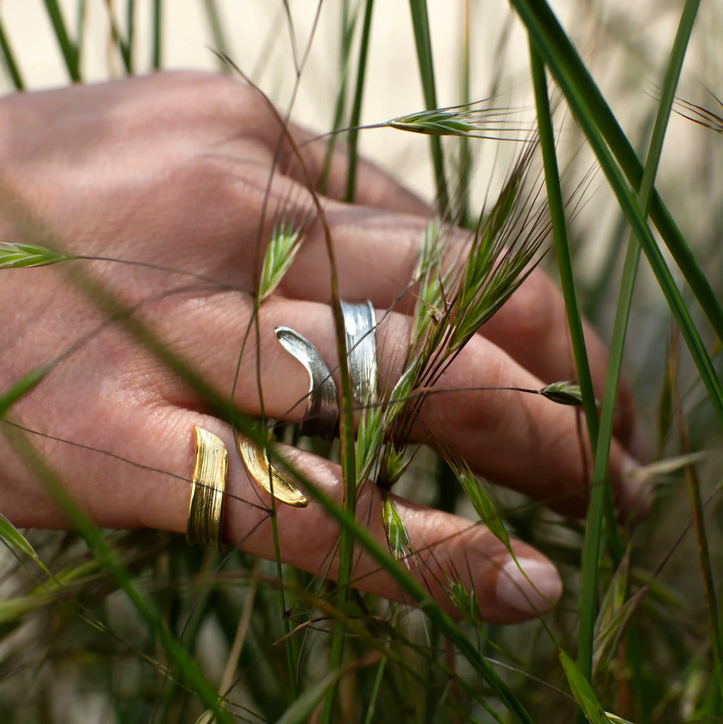 Gressringen slynger seg elegant og naturlig rundt fingeren – et unikt og sofistikert design skapt av naturen selv. Det originale gressstrået som ble brukt til å fremstille ringen, ble plukket i den danske naturen for mange tiår siden. Legg merke til hvordan alle de naturlige strukturene og organiske elementene i gressstrået er bevart. Designet av naturen selv og gjenskapt i 22 karat forgylt sterlingsølv.